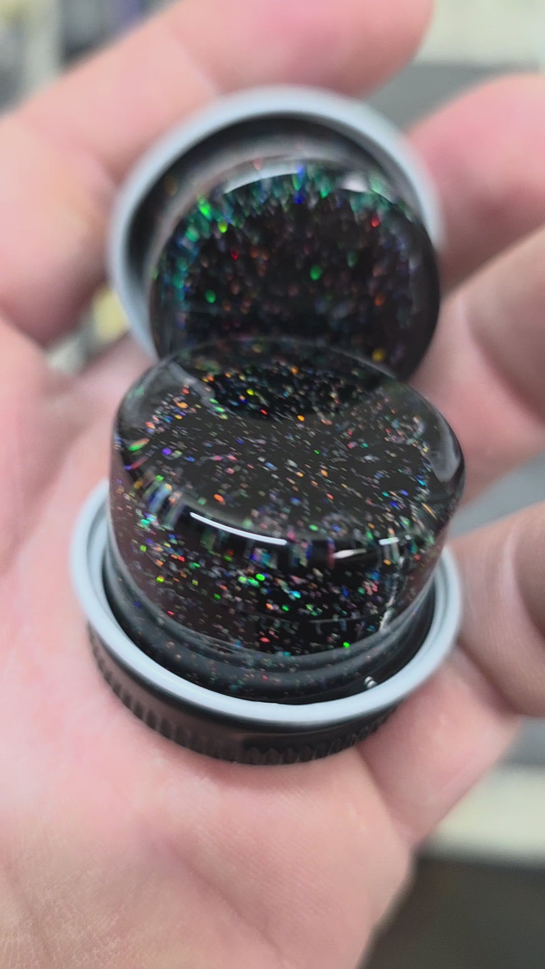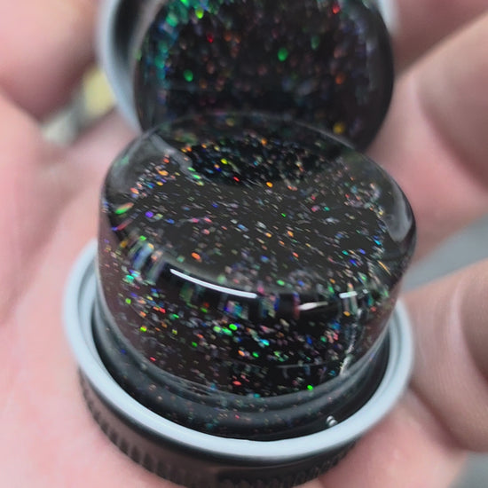 A jet-black base scattered with shimmering opal dust sparkles, like a universe condensed into glass. The shifting rainbow flashes dance as light moves across the surface, evoking galaxies in motion.