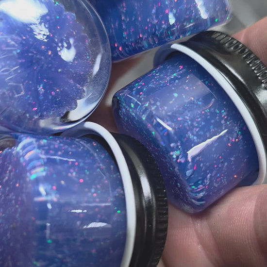 Handblown Blue Cheese glass jars, infused with suspended opal dust that shimmers through layers of deep, creamy blue. Each dome captures a burst of color that shifts from violet to pink under light, giving a mesmerizing depth and sparkle. The opal dust creates a speckled galaxy effect, sealed beneath the smooth curvature of each piece.