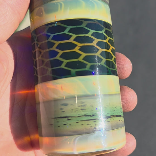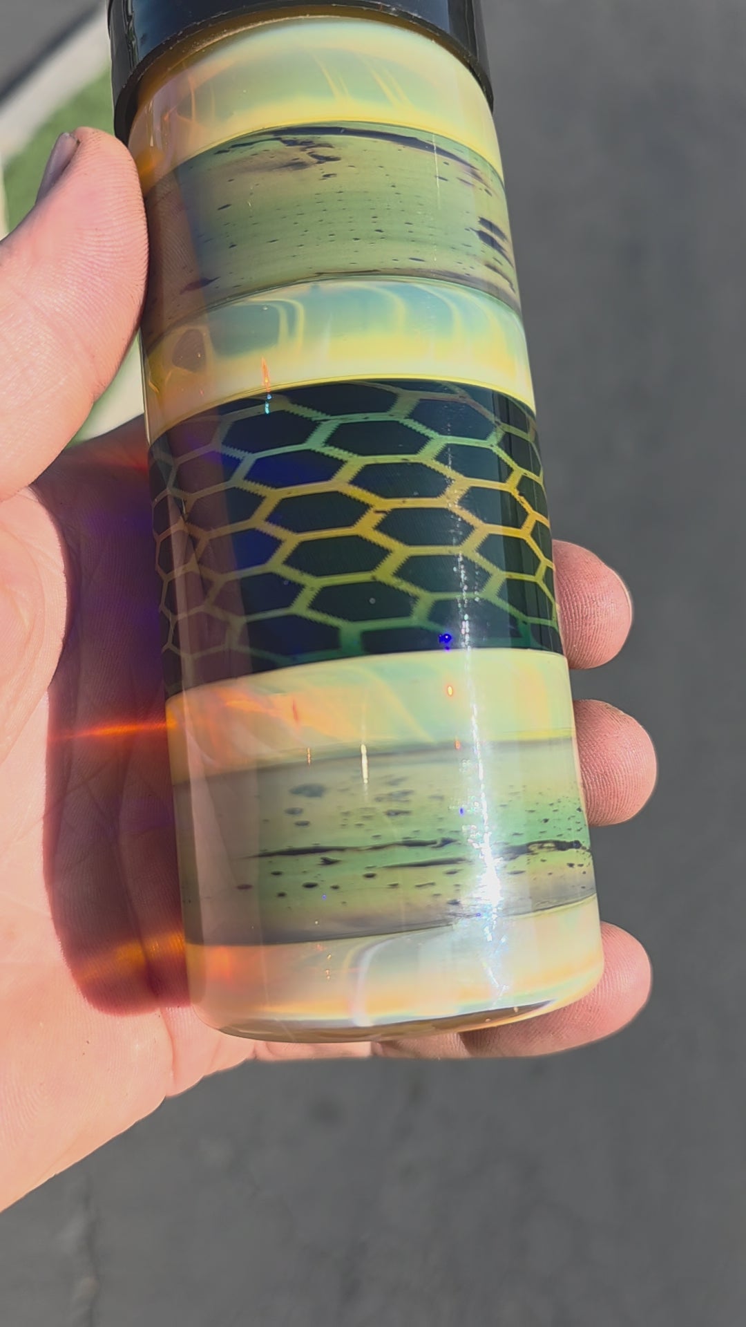 Large borosilicate glass jar layered with gold and silver fume, creating shifting tones of amber, teal, and soft greens. The centerpiece is a bold honeycomb band in deep cobalt and gold, standing out in sharp contrast against the smooth fume gradients above and below. The body features subtle speckling and organic striations that give the piece movement and depth. Fully kiln-annealed and topped with a threaded black lid, this jar combines the precision of pattern work with the organic beauty of fume coloring, making it both functional and collectible.