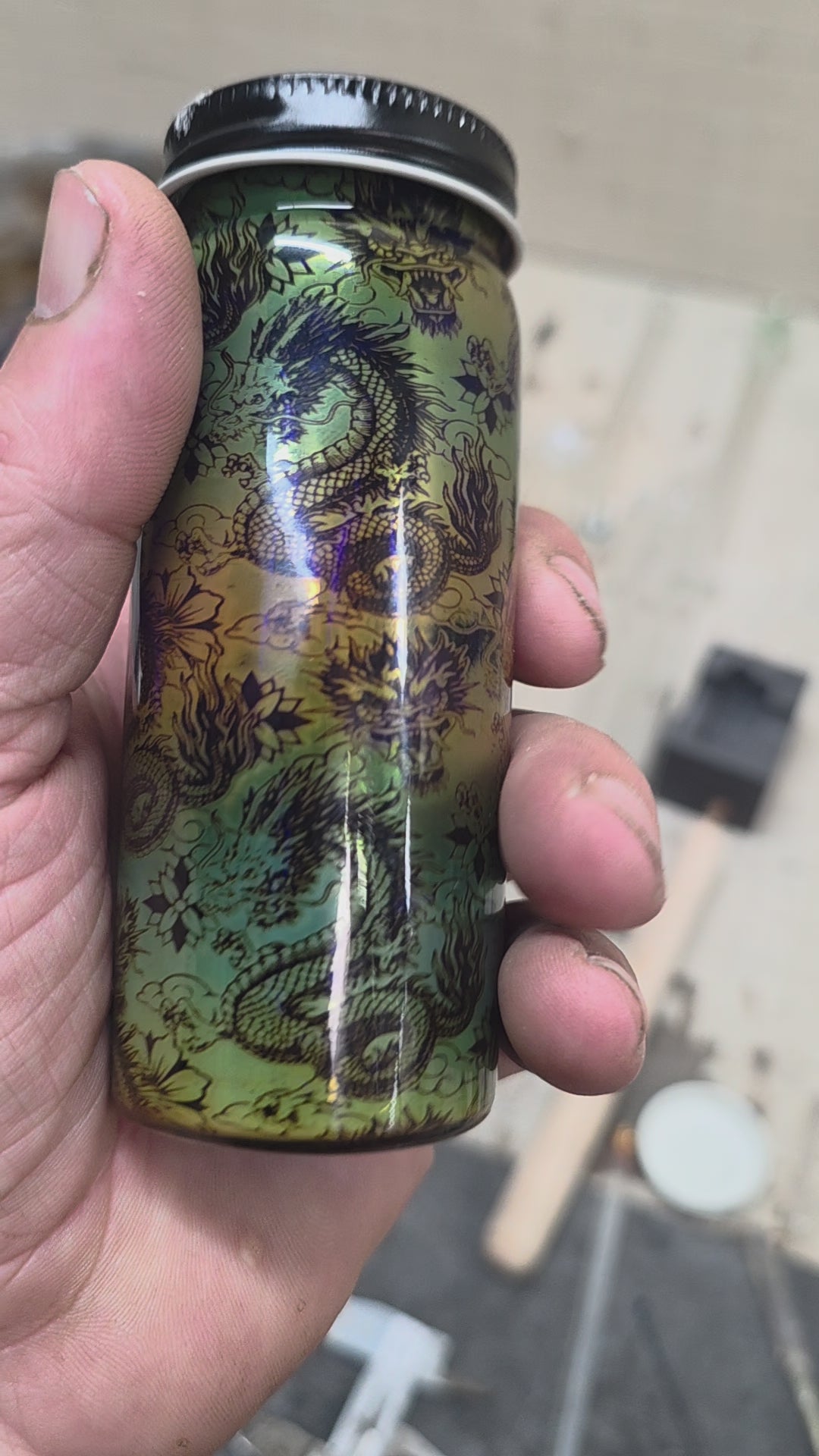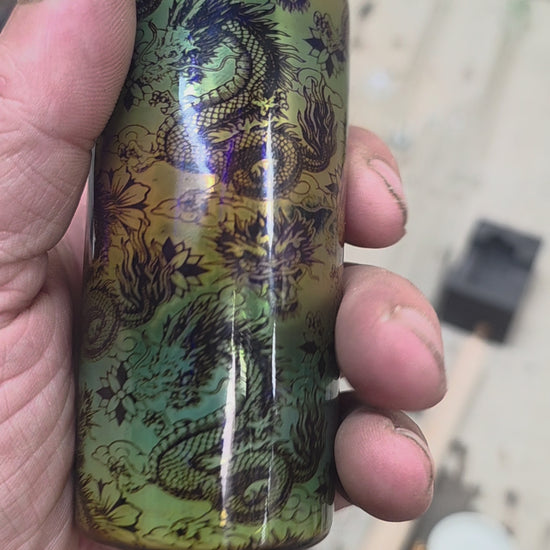 Crafted from borosilicate glass, this jar showcases layers of gold and silver fume that create an iridescent, color-shifting surface with rich green, amber, and blue tones. After fuming, the surface was meticulously laser-etched to reveal an intricate dragon motif, giving the piece both depth and a sense of movement as light plays across it. Fully kiln-annealed for durability and finished with a threaded metal lid, this jar bridges ancient symbolism with modern glass artistry. The interplay of metallic hues and precise dragon imagery makes it a striking blend of function and fine art.