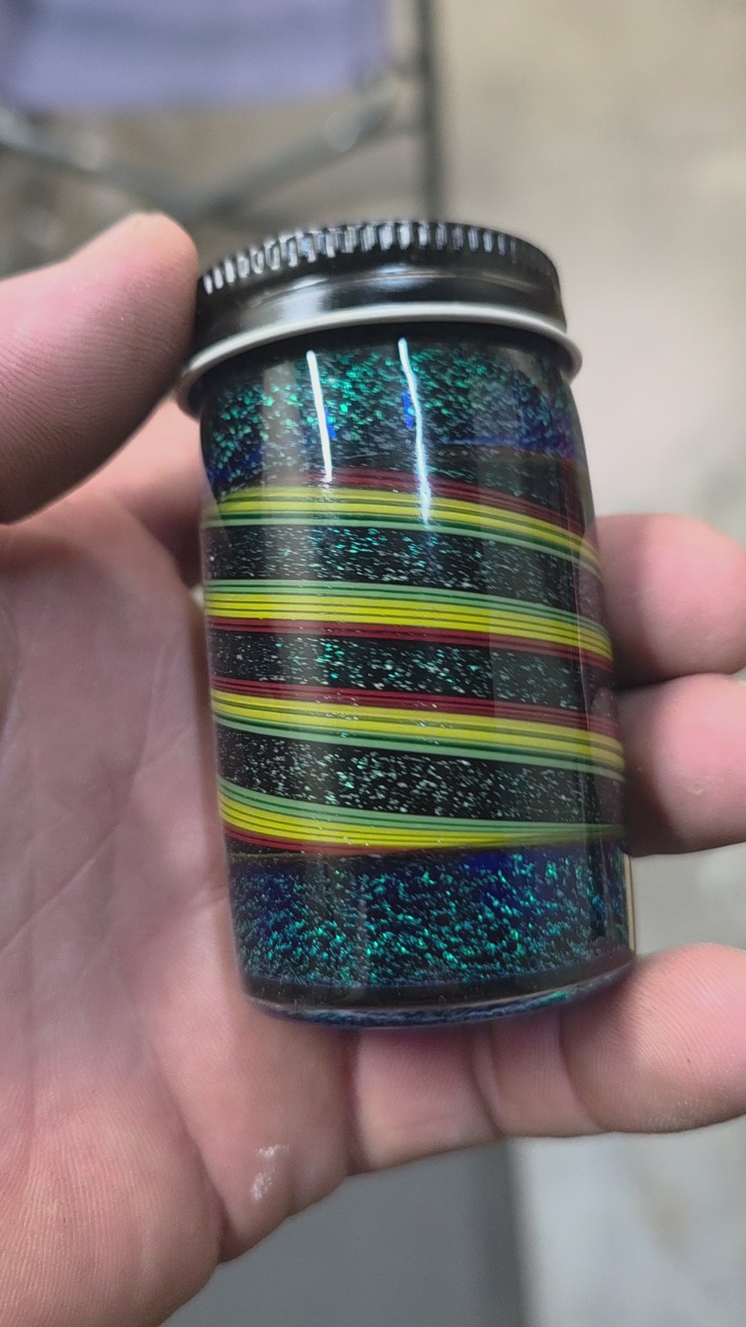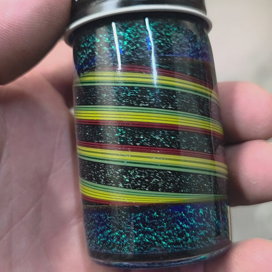 Handmade borosilicate glass storage jar featuring vivid red, yellow, and green wrap-lines encased over a shimmering galaxy-like background of dichroic sparkle. The piece is fully kiln-annealed for durability and finished with a threaded metal lid, blending functional utility with vibrant artistry. The contrast between the bold stripes and the deep iridescent field creates a striking interplay of light, color, and movement.