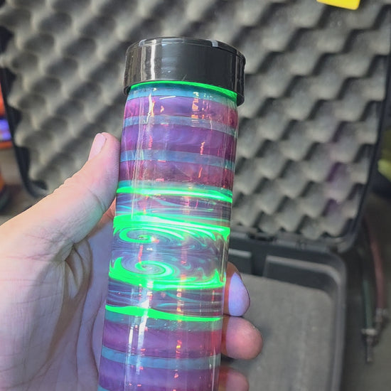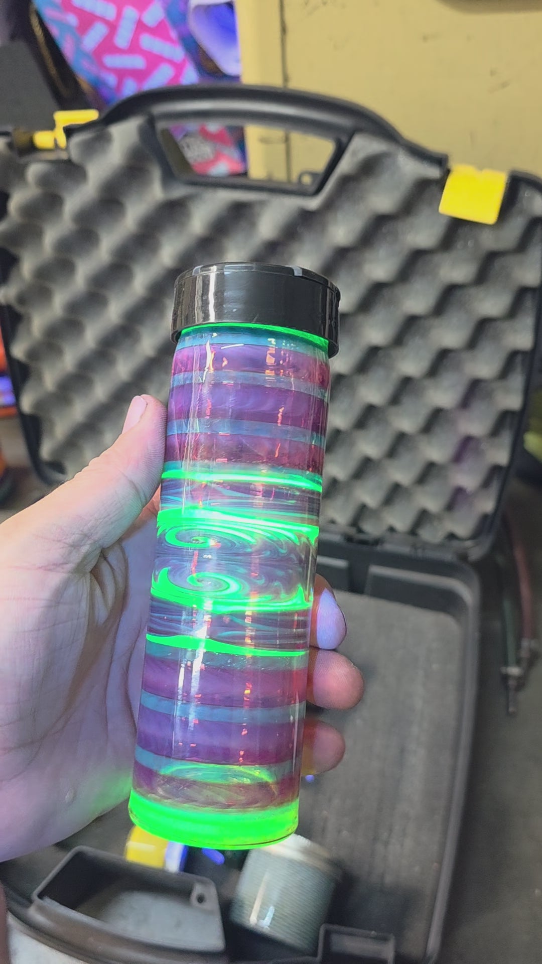 Handmade borosilicate glass jar featuring layered bands of vibrant colors in shifting purples, blues, and pinks, encased in clear for depth and reflection. The design includes a central marbled swirl section that adds movement and contrast to the repeating bands. Under natural light, the colors show a soft iridescence, while under UV/blacklight the base and rim ignite with a vivid neon green glow. Fully kiln-annealed and finished with a threaded black lid, this jar balances precise colorwork with striking UV-reactive effects, making it both functional and visually dynamic